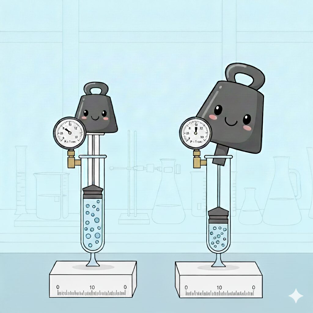 - 絵: ピストンをギュッと押すと(圧力UP)、中の空気が小さくなる(体積DOWN)